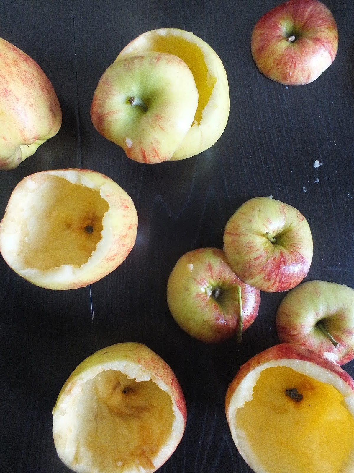 Couper le tiers supérieur des pommes et les creuser tout en laissant un fond et un bord suffisemment épais pour ne pas qu’elles se percent à la cuisson. Réserver la chair, enlever les bouts de trogons et couper le tout en petits morceaux.